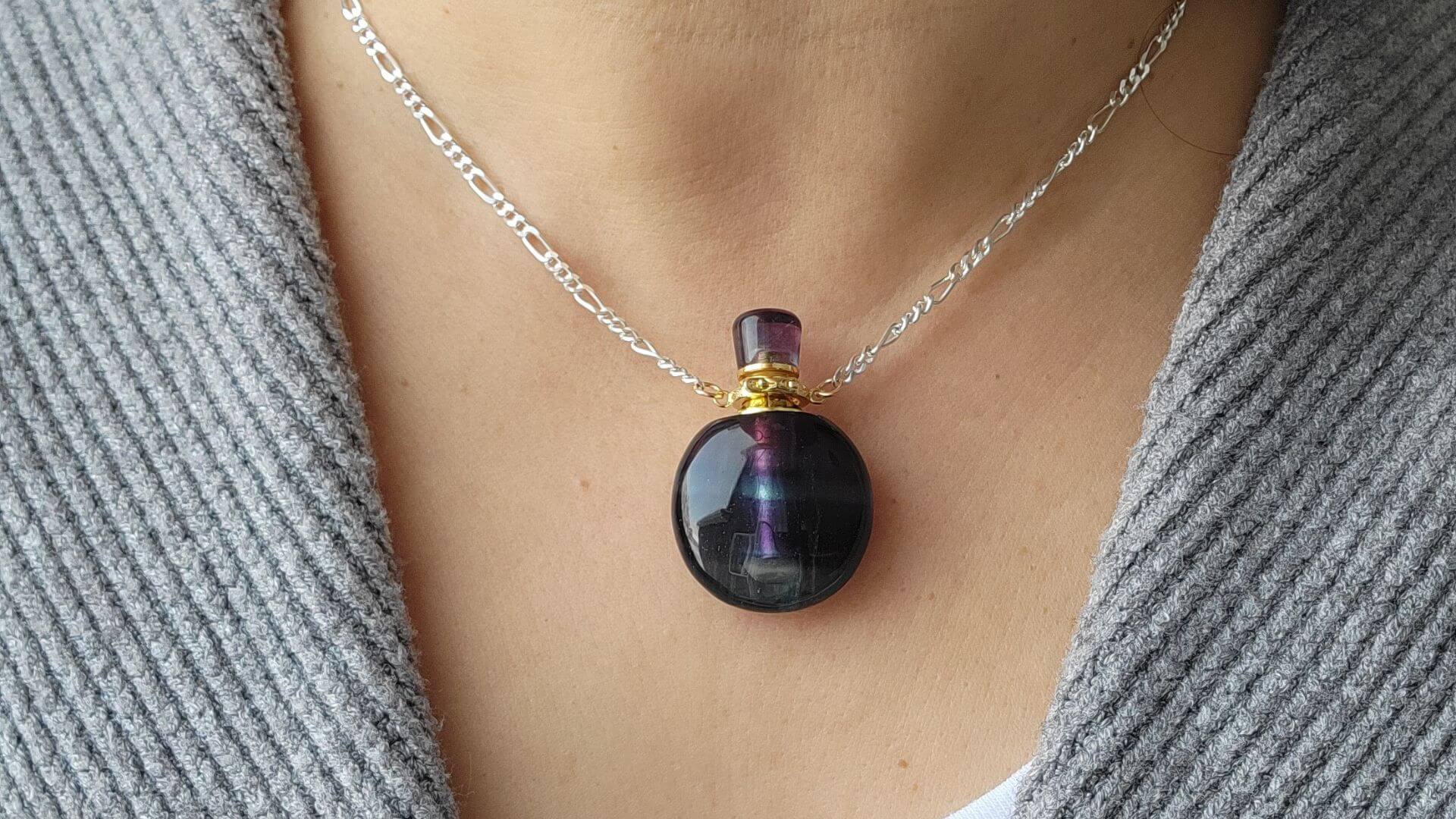 Luxury Fluorite Gem Bottle Pendant Necklace for Essential Oils or Perfume