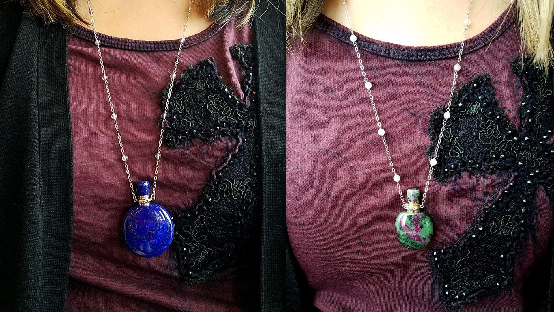 Pairing these oils with gemstone bottles adds another layer of meaning. Each pendant is not only beautiful but also functional, keeping your favorite scent close at hand. Gemstones like amethyst, malachite, and lapis lazuli have long been valued for their symbolic properties, from clarity and calm to strength and protection. Together, essential oils and gemstone pendants create a wearable form of self-care — combining natural beauty, healing traditions, and modern style in one unique piece of jewelry.
